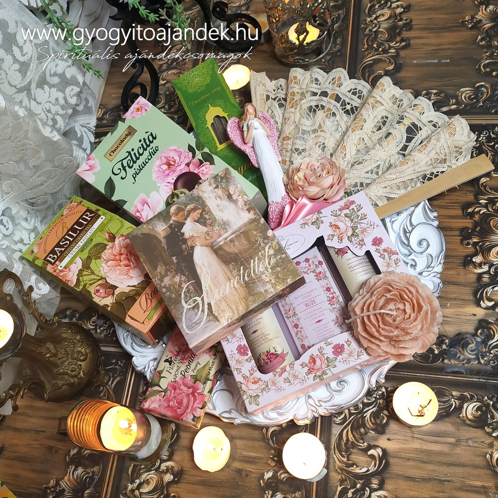 Ez a luxus ajándékcsomag tökéletes választás Valentin napra, nőnapra, születésnapra, házassági évfordulóra, vagy akár egy lánykérés mellé kísérőajándéknak.Romantikus, kifinomult összeállítás, amely a rózsa motívum köré épül, és az angyalok által védett szerelem üzenetét közvetíti.