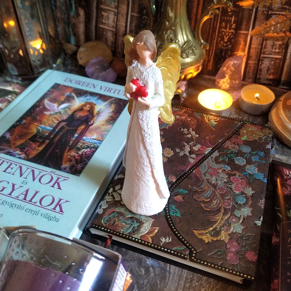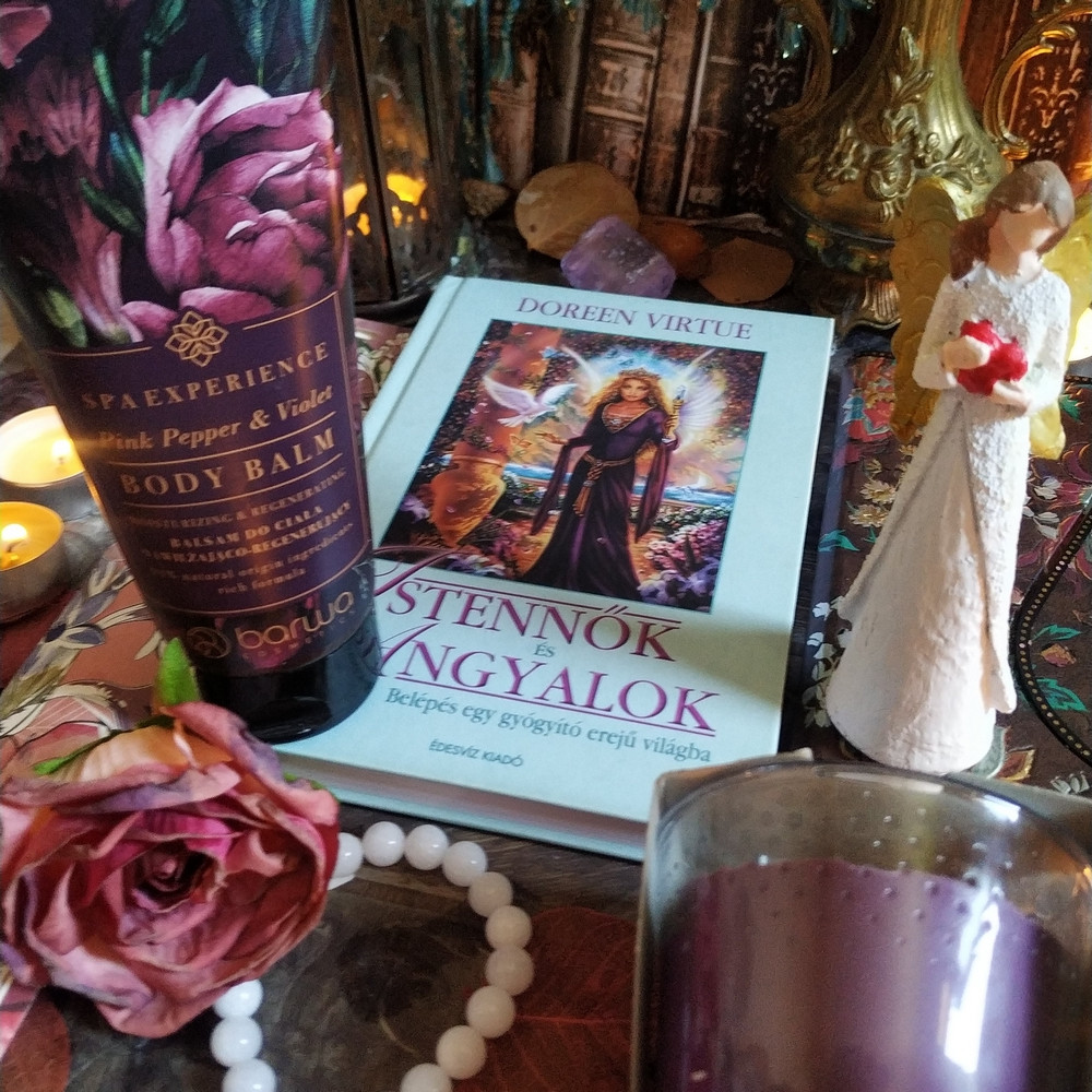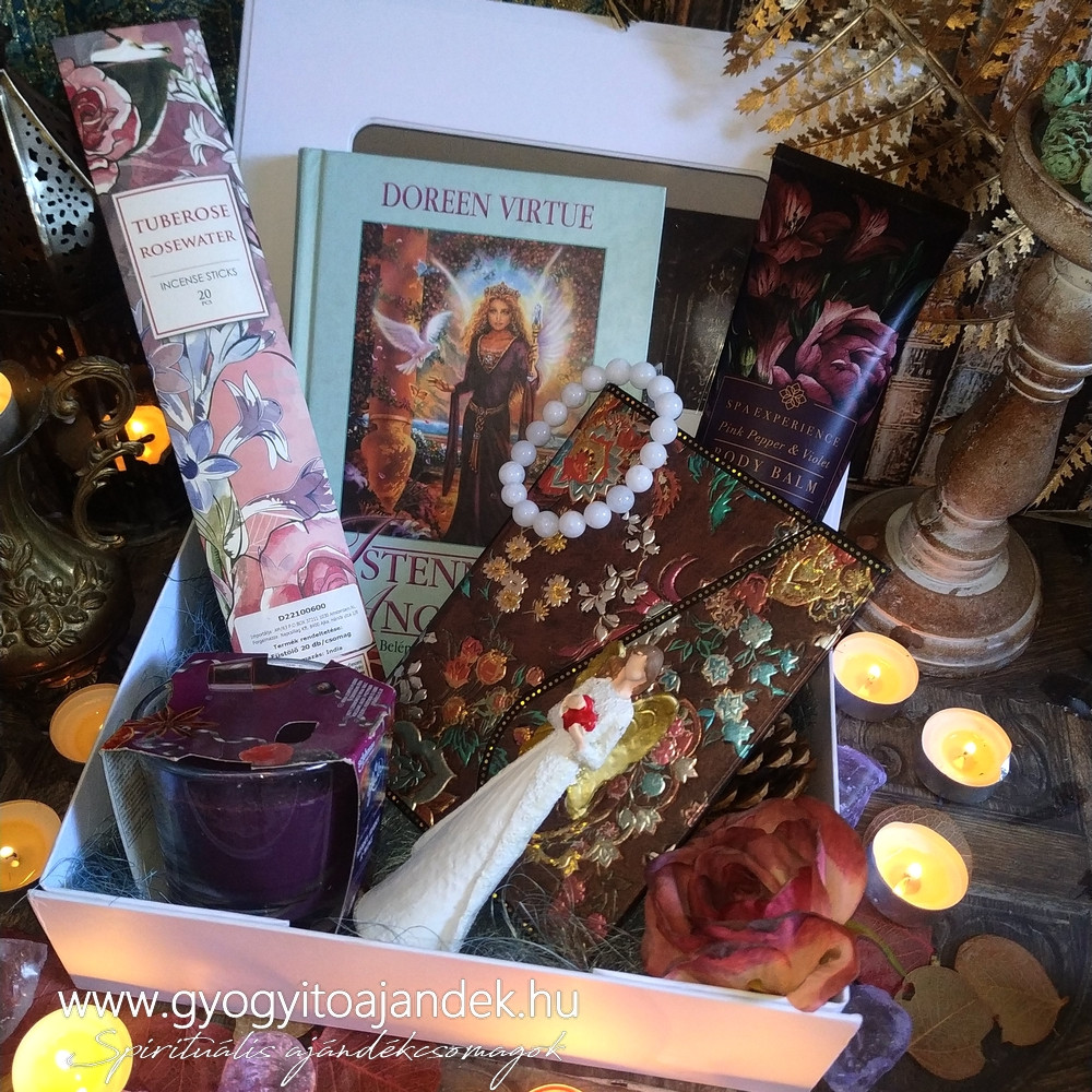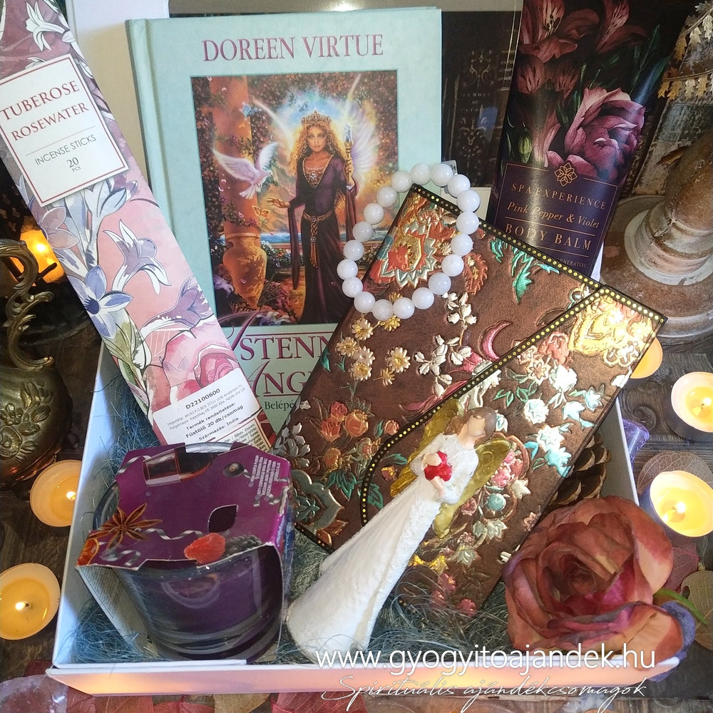 A csomag középpontjában Doreen Virtue nagy sikerű könyve, az Istennők és angyalok áll, amely inspiráló útmutatást nyújt a női lélek kibontakozásához és az angyali erők befogadásához. Az olvasás élményét egy elegáns angyalfigura kíséri, amely védelmező jelenlétével emeli a mindennapok fényét. A test és a lélek kényeztetéséről gondoskodik egy márkás illatgyertya, mely vörösboros jegyeivel, bogyós gyümölcsök és fűszerek aromáival varázsol meghitt hangulatot, valamint a tubarózsa füstölő, amely ellazít, és segít ráhangolódni a belső békére. A szépség és gondoskodás része a pink pepper–viola illatú testápoló, amely bársonyossá és illatossá varázsolja a bőrt, míg a tejkvarc karkötő az angyalok tisztaságát idézi, támogatva a lelki harmóniát és a szeretetteljes kapcsolódást. Emellett megszünteti az áldozatszerepet. A tejkvarc gyengéd rezgése segít megnyugodni, feloldani a feszültségeket és befogadni az angyalok üzenetét.
