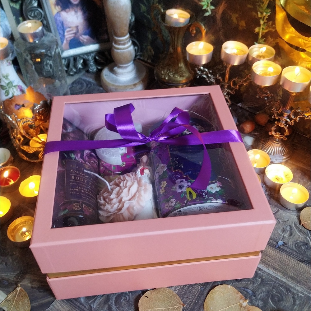 - Prémium ajándékdoboz rószaszín színben, lila szatén masnival díszítve
