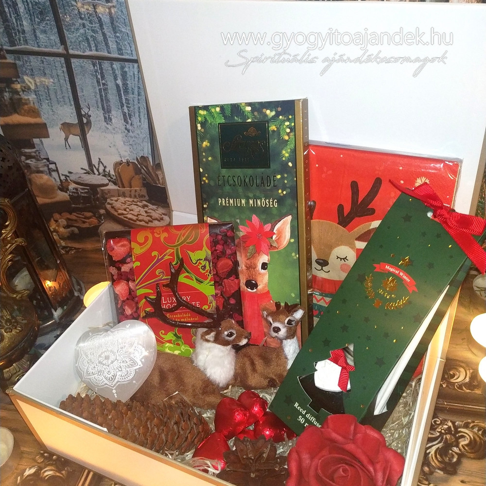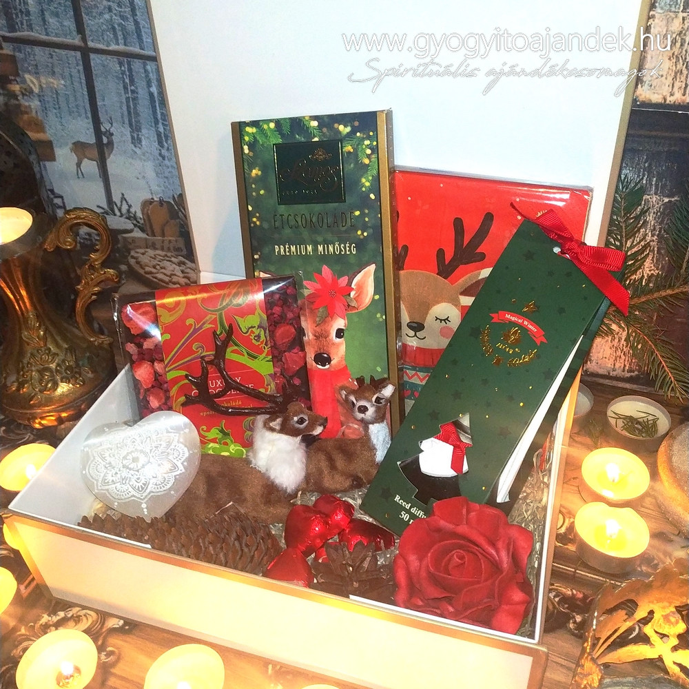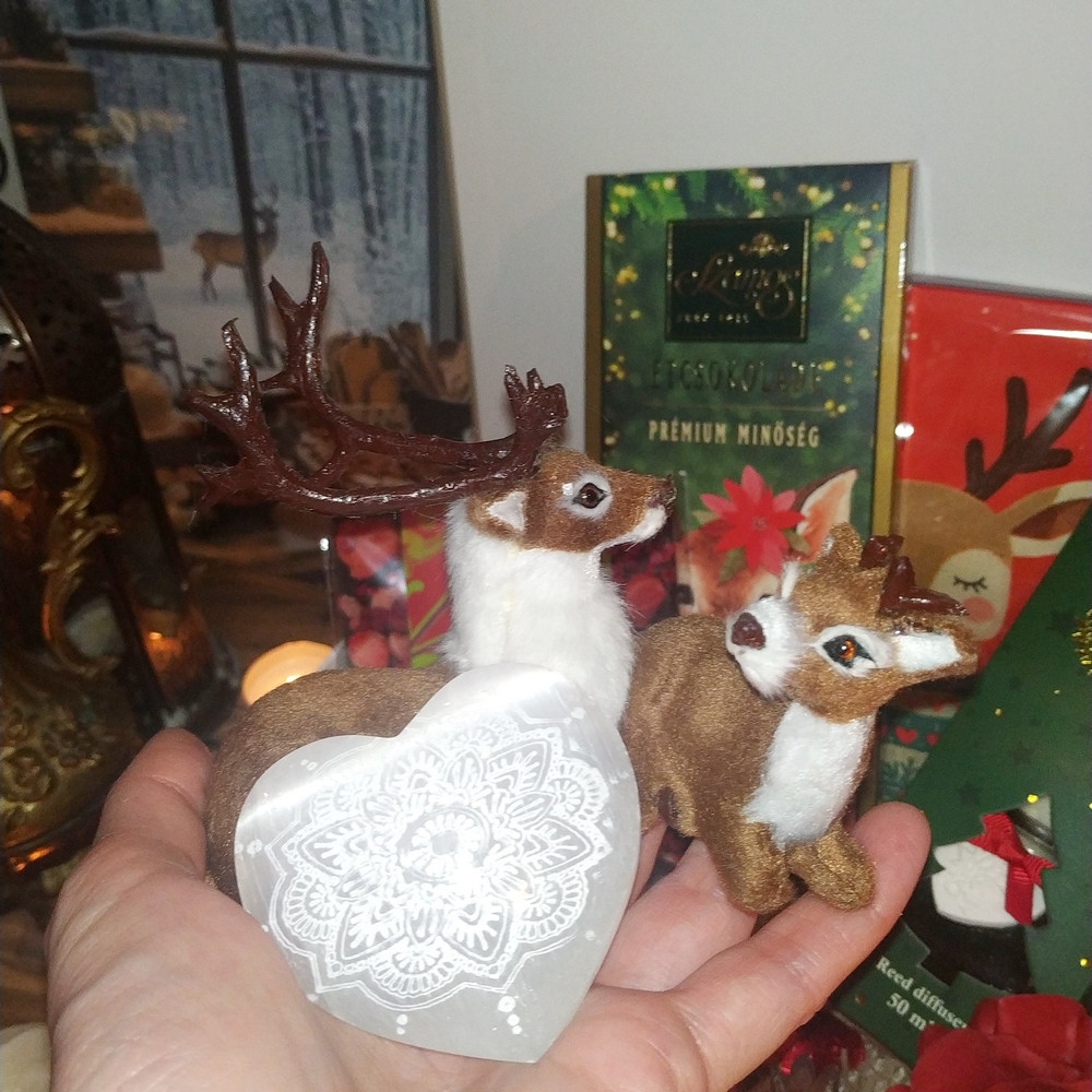 Ajándékbox szerelmes szarvas párral és varázslatos szelenit szív ásvánnyal! Egy ajándék, amely egyszerre mesél a tiszta szerelemről, az ünnepi varázsról. A pihe-puha szerelmes szarvas párocska szimbolizálja a meghitt összetartozást: két csodálatos erdei lény, akik a tél csendjében is egymás melegsége felé fordulnak. A szív alakú óriási szelenit ásvány pedig mindezt magasabb szintre emeli — a szelenit a tisztaság, a béke és a kapcsolat harmonizálásának kristálya. Úgy tartják, segíti a lelket megnyílni a mély szeretet és az őszinte kapcsolódás felé. Egy szív alakú szelenit különösen erősen hordozza ezt az üzenetet: “Ez a szerelem tiszta, mint a friss hó. Ez a szerelem a miénk.”