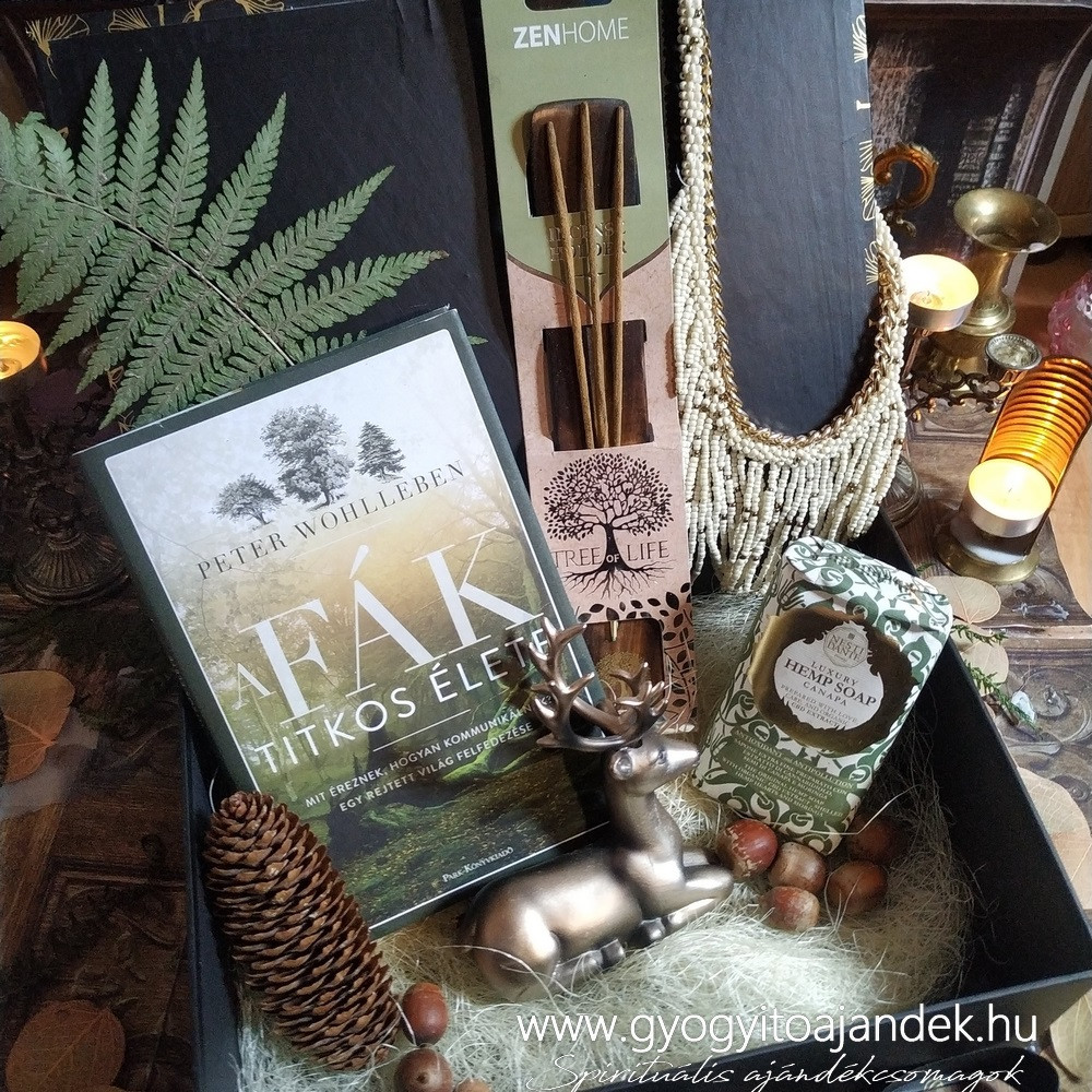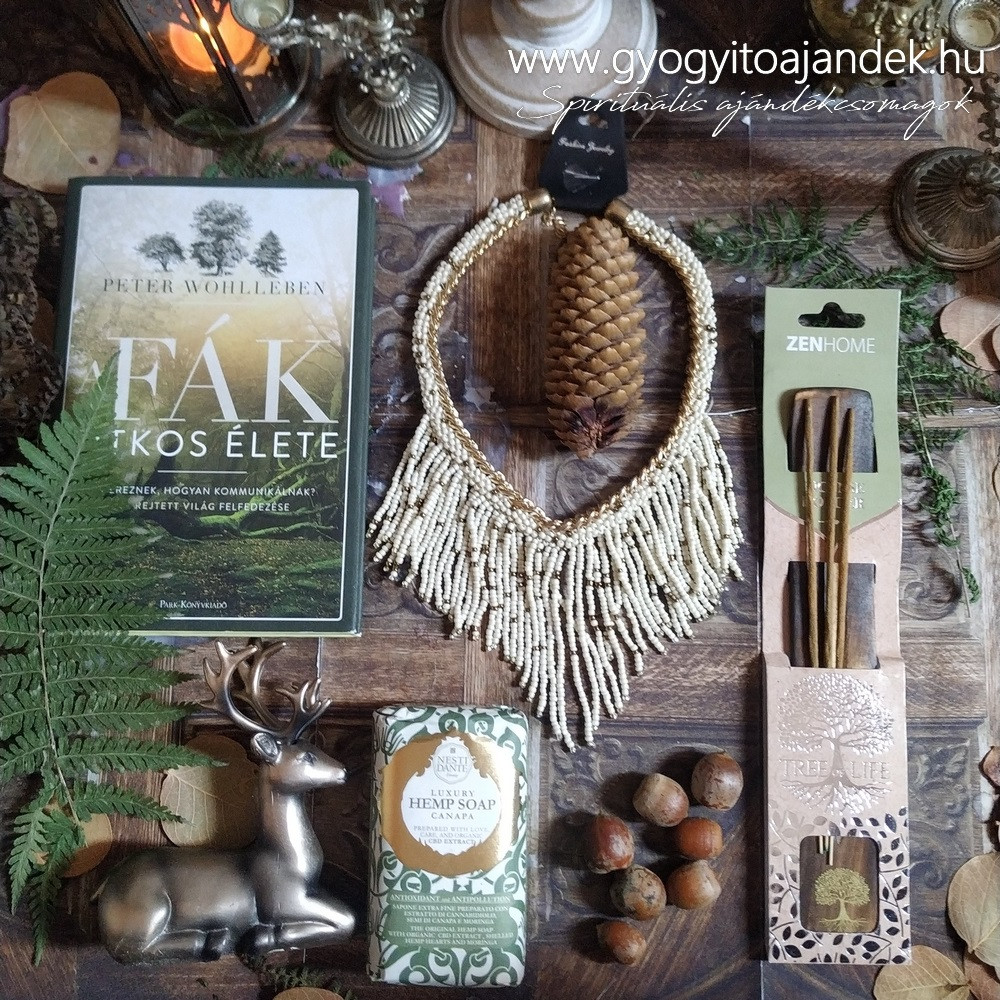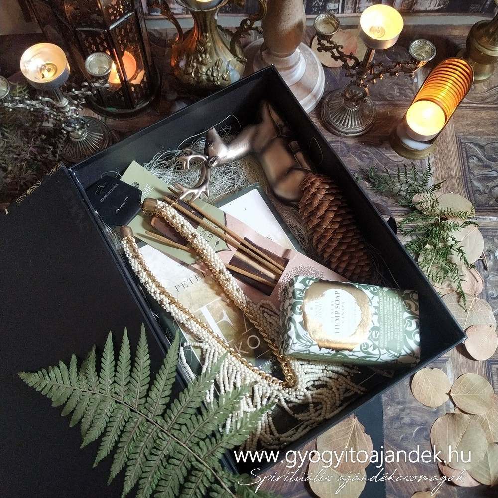 Ez az ajándékcsomag egy olyan hölgy/lány számára okozhat meglepetést, aki imádja az erdőt, az erdei állatokat, a különleges ékszekeret és szeret olvasni. Egy gyönyörűen kidolgozott szarvas figurát rejt az ajándékbox, mely szimbolikáját tekintve szorosan kapcsolódik az erdőhöz. A szarvas mitológiai alakja összefonódik az életfával, mivel agancsai nagyon hasonlítanak a fa ágaihoz. Maga a káprázatos szarvas agancs a napsugarakat és a termékenységet is jelképezi, így a felnőtt bakszarvas a gazdagság és bőség jelképe. Az ősi ábrázolásoknál minden fának lelke van, ennek összessége, az erdő. Az erdő egy istenség egyetemes képében testesült meg, ő pedig a szarvas. A szarvas is közvetítő ég és föld között, mint az istenek hírnöke.