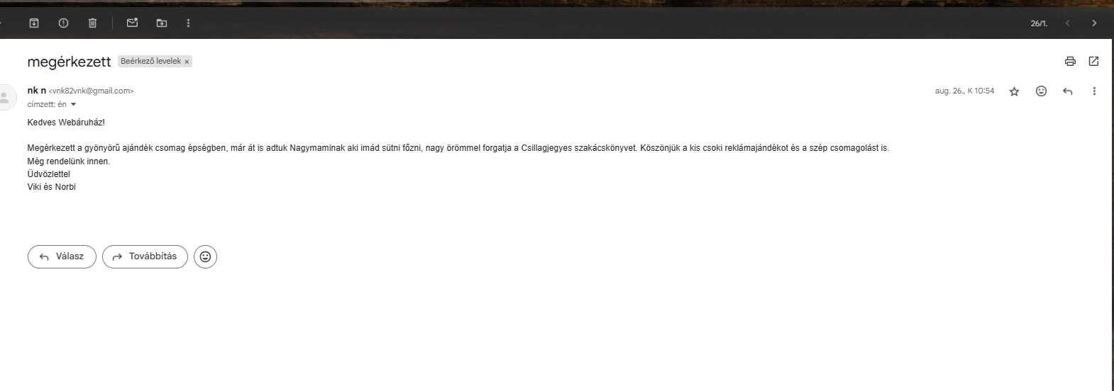 Egy kedves visszajelzés érkezett e-mail címünkre Vikitől és Norbitól, akik a Csillagjegyek a konyhában című szakácskönyves ajándékcsomagot nagymamájuknak vásárolták meg szülinapi ajándékként:)
